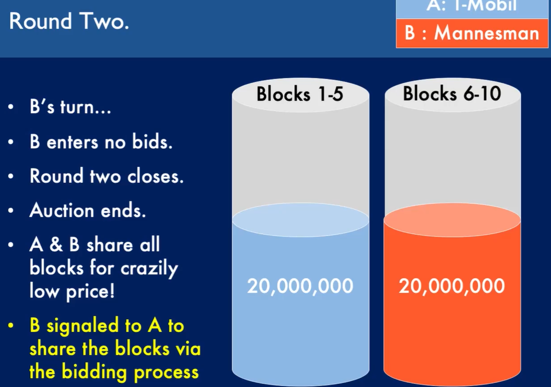 Q: What’s an example of collusion between bidders? A: T-Mobi land Mannesman colluding to split the German RF spectrum for a low price.