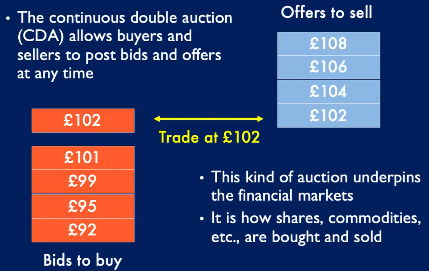 What happens if we put an open ascending auction and a reverse auction together? Sellers offer decreasing prices and buyers make increasing bids until the values meet.
