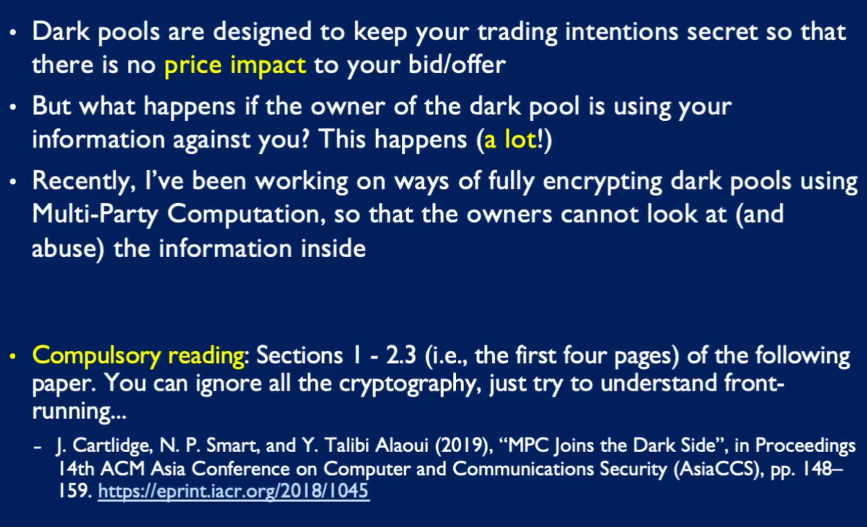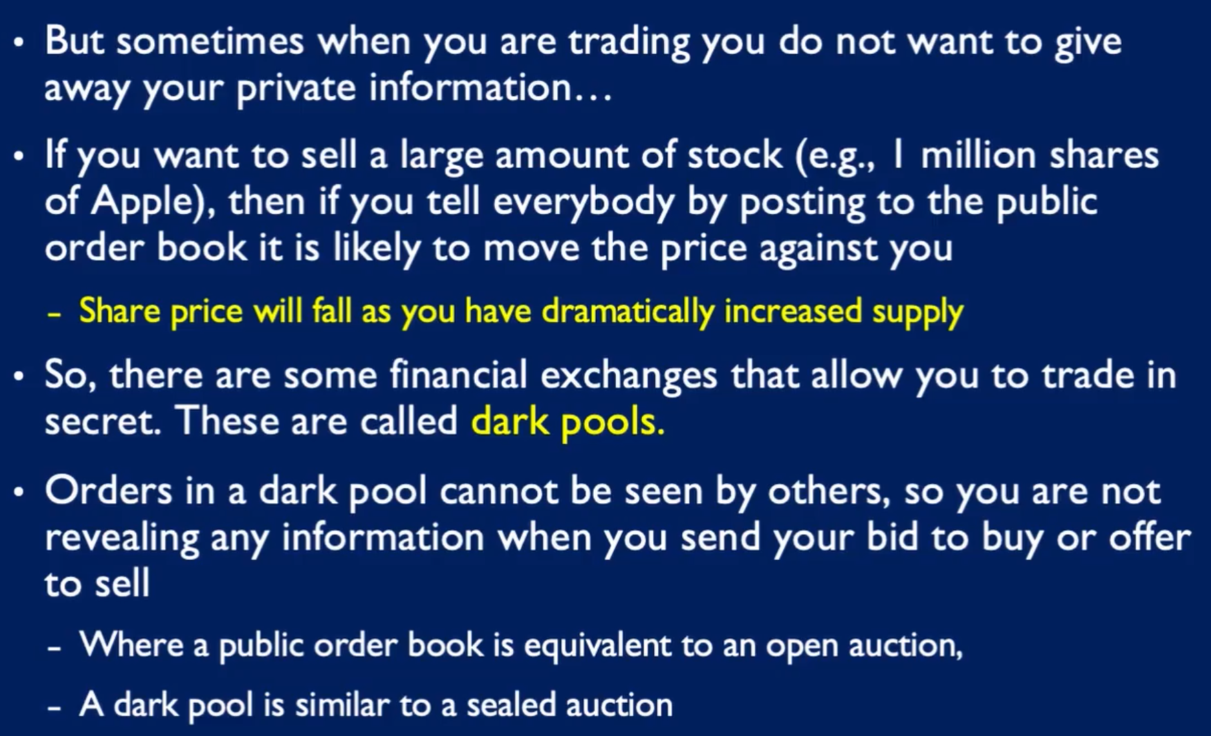Making large trades in a market often causes the price to go down as other traders assume you have some information causing you to sell such a large quantity. Because of this, “dark pools” have emerged - markets where the orders are hidden from participants. Dark pools started to appear in the 80s.