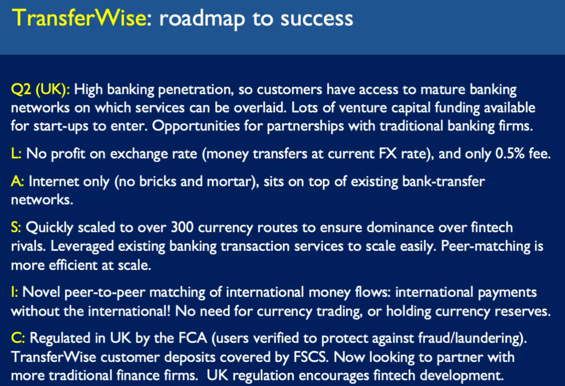 Transfers between different currencies with low fees by not actually doing international transfers, just depositing/withdrawing from local bank accounts. It uses very little startup capital as it matches customer funds on either side.