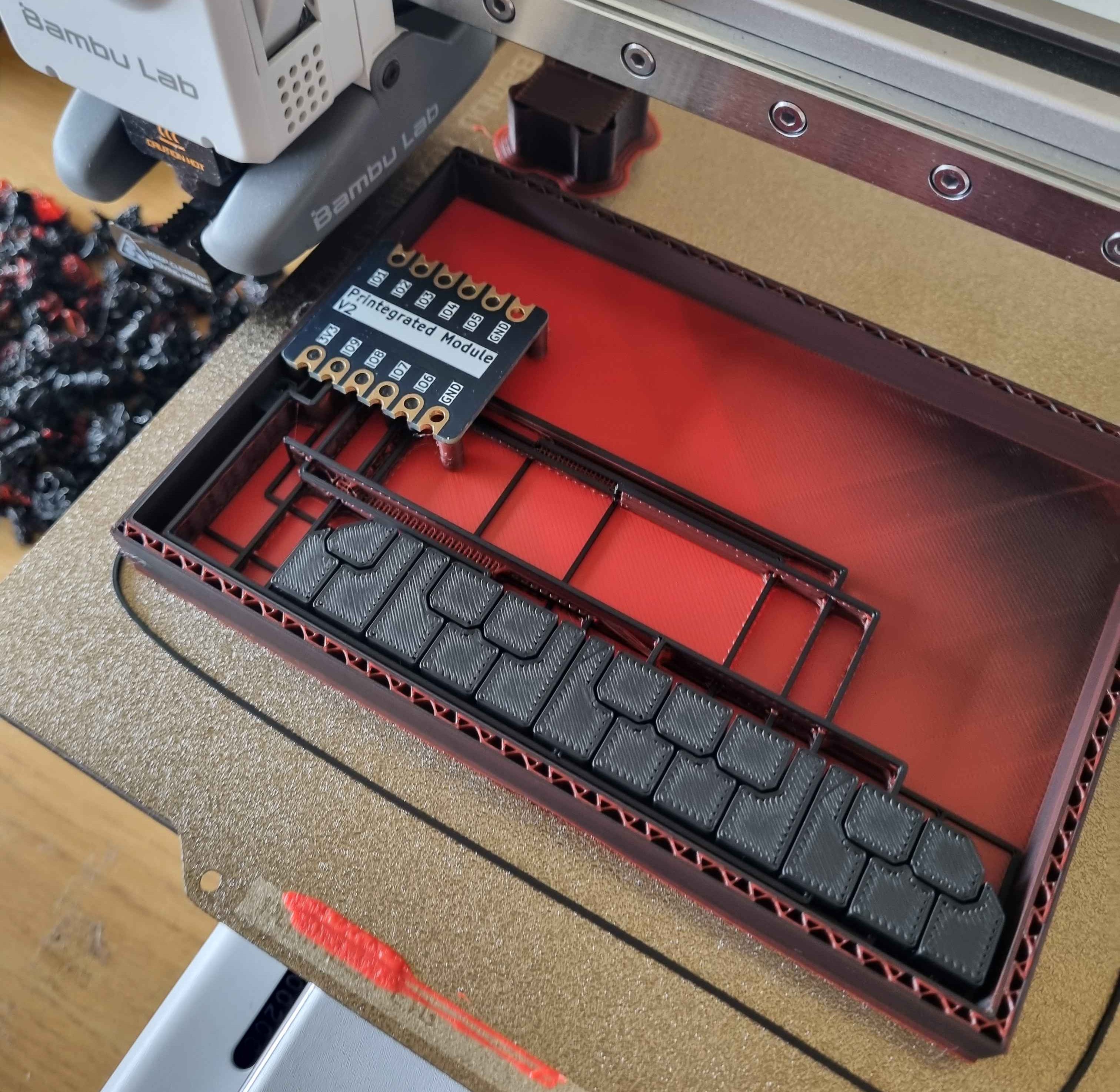 Now my idea was relatively simple, I could print the keys out of conductive filament, run them to IO inputs on the board, and run 3v3 through a stylus also printed with conductive filament. I could continuously read the inputs as analog values, and when a key was pressed I’d see the reading go high.